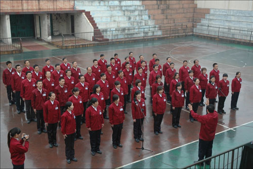 机关管理人员军训周活动在篮球场汇报演出
