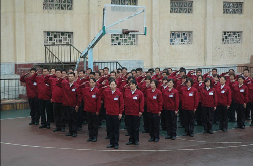 机关管理人员军训周活动在篮球场汇报演出